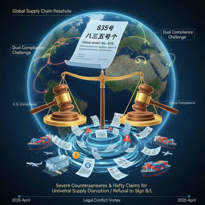 2026年4月,中国正式颁布并施行第835号令《反外国不当域外管辖条例》。这一拥有20条核心规定的法规,标志着应对“长臂管辖”进入系统性法治阶段。对于全球物流专家而言,中国835号令反制裁影响已成为不可忽视的战略级风险,彻底重塑了跨国供应链底层逻辑。